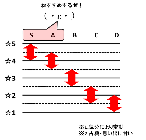 いろいろな作品を感情的かつ恣意的に分類するのみです。評価の目安は以下の図の通り。S(旧A)とA(旧B+)はオススメと考えてもらっていいかと。見ての通り他人には甘いので、基本的にはいいところを探してホメて伸ばします。